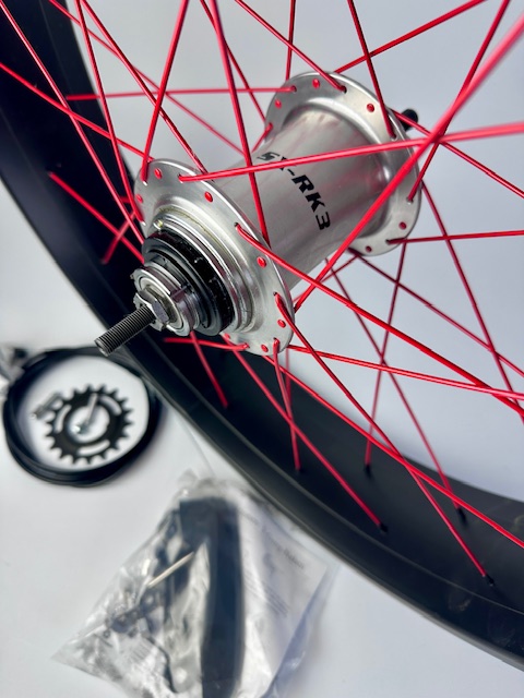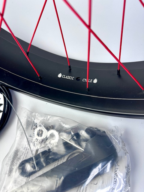 36 x 2,0 mm Speichen rot, Nippel schwarz, 102 mm doppelwandige Alufelge, mattschwarz, Hinterrad, 102 mm Alufelge, rote Speichen, Drehgriff Schalthebel mit 2200 mm Zug