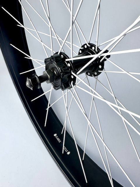 36 x 2,0mm Speichen weiß, Nippel schwarz, 82 mm doppelwandige Alufelge mattschwarz, Vorderrad, weiße Speichen, Alunabe mit Scheibenbremsaufnahme von Classic Cycle mit fester Achse, Vorderradnabe Classic Cycle Art. 321413 aus Alu schwarz mit Scheibenbremsaufnahme und fester Achse