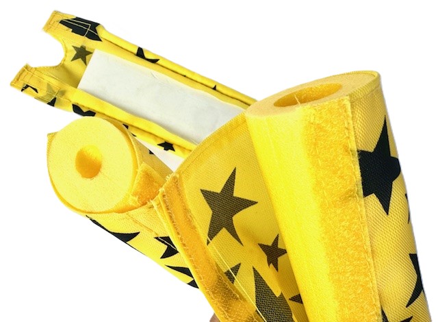Dieses dreiteilige Schutzpolster-Set in leuchtendem Gelb mit schwarzen Sternen ist das perfekte Accessoire für jeden Old-School- oder Retro-Build.