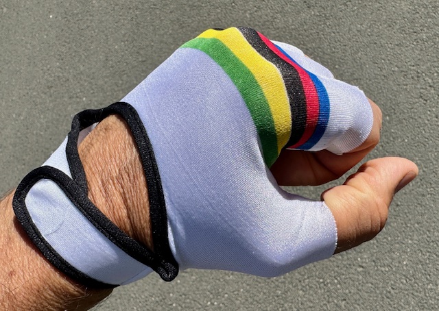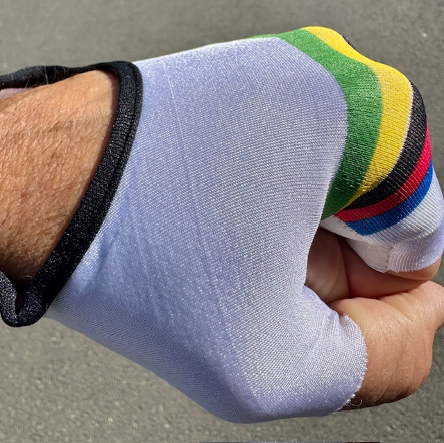 Original Vintage Fahrradhandschuhe weiß mit bunten Streifen, L / 10