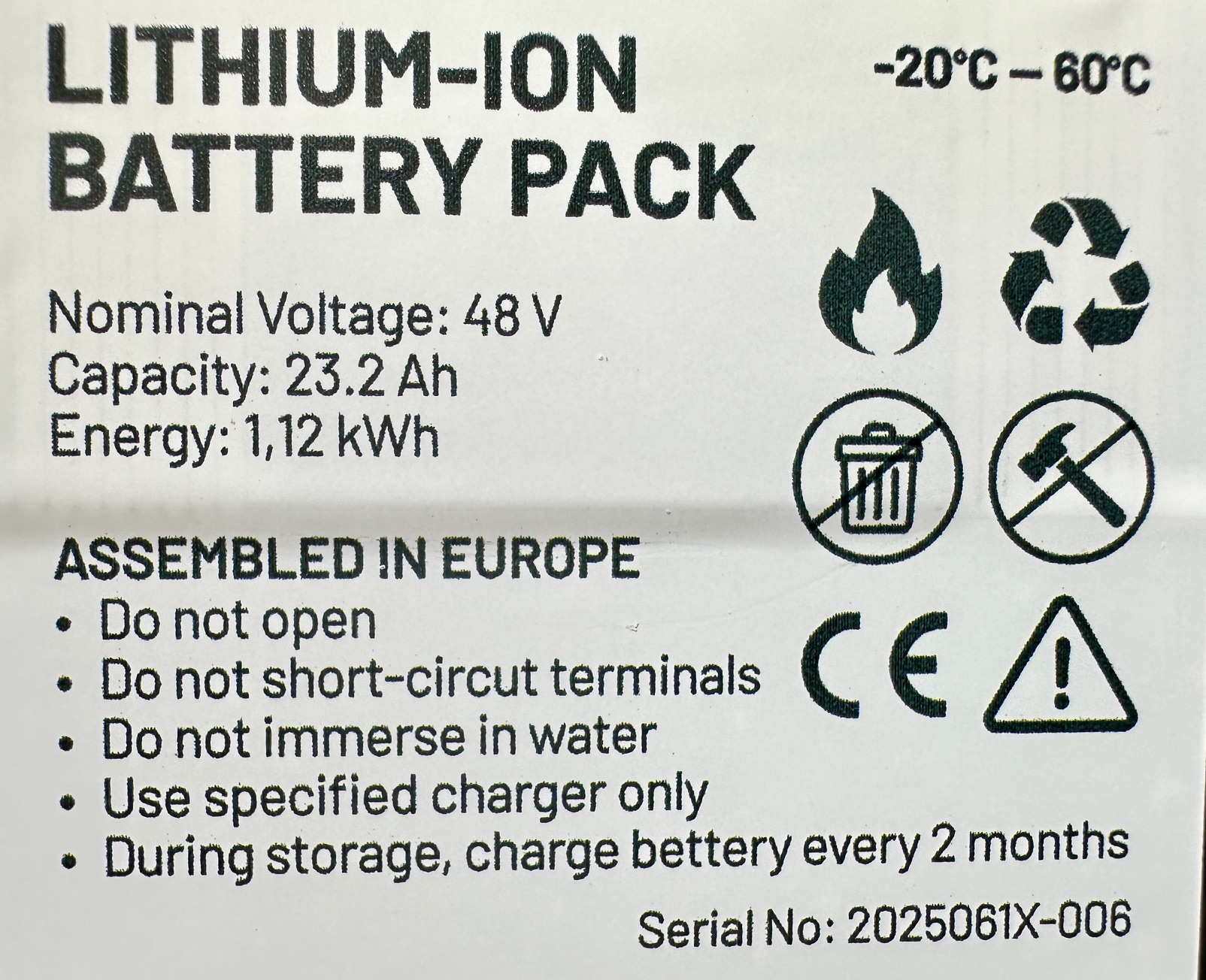 Kapazität: 1113.6 Wh = 48V x 23.2Ah